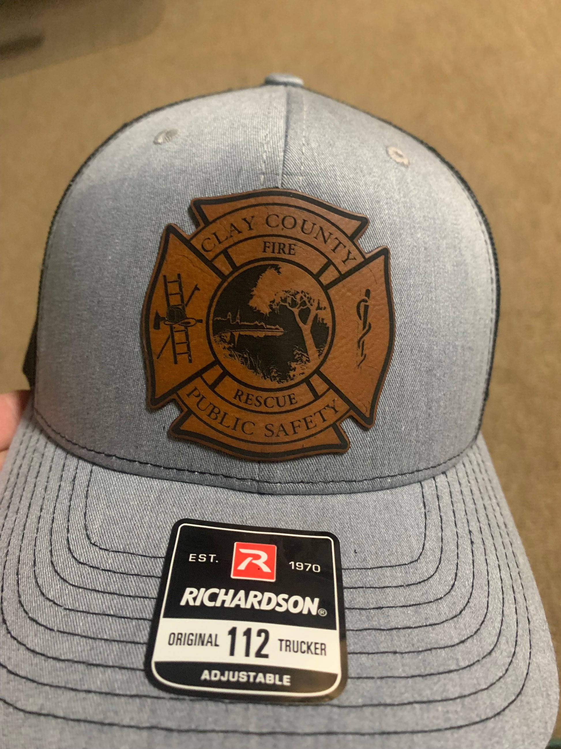 Richardson 112 Grey/Black cap or Black/Black with Leather Clay County Fire Rescue Logo on front, Lazer engraved leather logo. Snap Back Cap